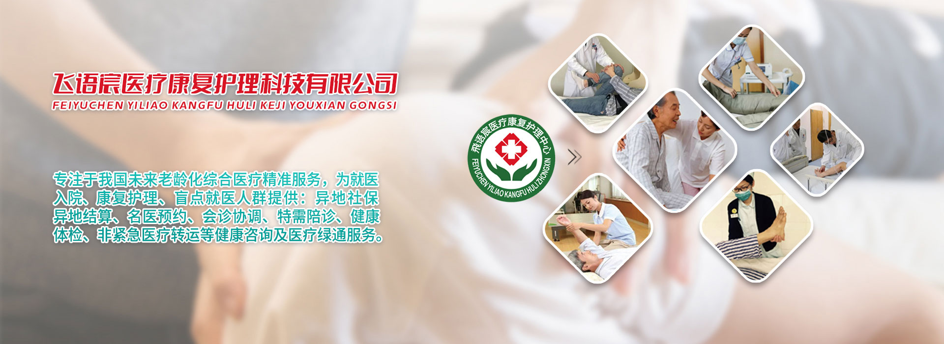 •   深圳市飛語宸醫療康復護理科技有限公司,是一家專注于健康產業領域中具有卓越影響力的創新型服務企業。公司致力于為社會提供全方位、高品質的醫療、康復、護理及人工智能綠通就醫服務。憑借前沿最先進的醫療技術信息和專業的團隊,注重服務深耕細作,為解決健康綠通服務壁壘,相繼融通全國各地數百家實力派醫療機構、養老機構、護理機構、陪診機構、陪護機構、助浴機構的社會資源力量,使醫療綠通精準服務于社會。